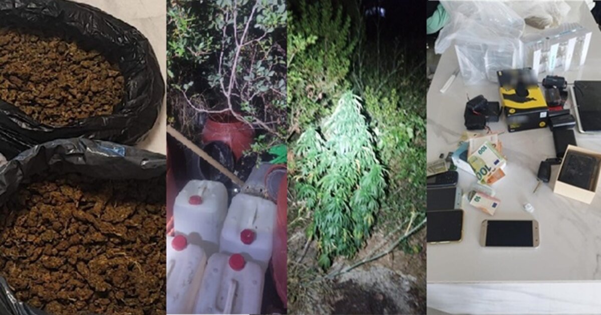 Στην κατοχή των συλληφθέντων βρέθηκαν και κατασχέθηκαν πάνω από επτά κιλά κάνναβης αλλά και δενδρύλλια , καραμπίνα, φυσίγγια, συσκευές εντοπισμού, κάμερες παρακολούθησης και drone