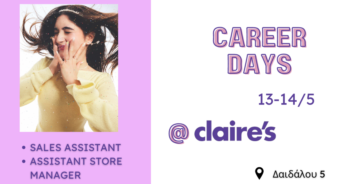Για πρώτη φορά στις 13-14/5 στο νέο κατάστημα Claire’s, που βρίσκεται στην οδό Δαιδάλου 6, θα πραγματοποιηθούν ημέρες καριέρας. Όπως αναφέρεται σε σχετική ανακοίνωση "πρόκειται για ένα event αφιερωμένο στη γνωριμία μας με υποψηφίους που αναζητούν άμεσα απασχόληση.