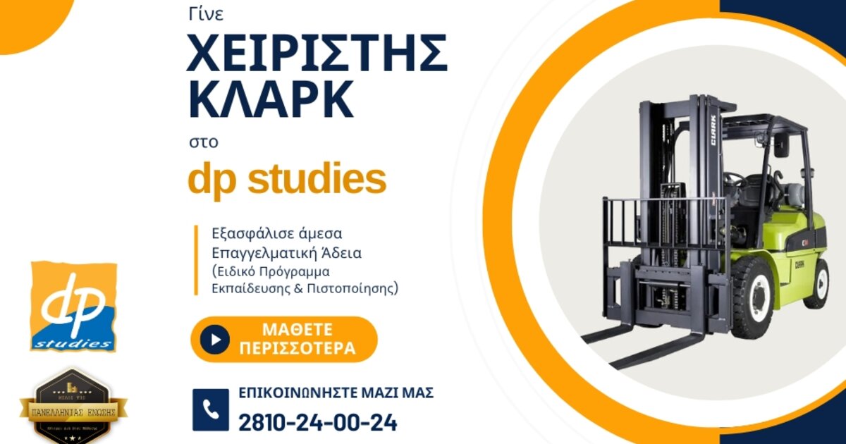 Όσοι ενδιαφέρεστε για τα σεμινάρια, τα οποία οδηγούν στην απόκτηση άδειας "Χειριστή Κλάρκ", δηλώστε συμμετοχή στο dp studies, επικοινωνώντας μαζί μας στα τηλέφωνα: ☎️ 2810.24.00.24, ☎️ 2810.313.603, ☎️ 2810.285.627 και εμείς θα σας κατευθύνουμε για τα επόμενα βήματα σας μέχρι την απόκτηση της άδειας ασκήσεως έργου.