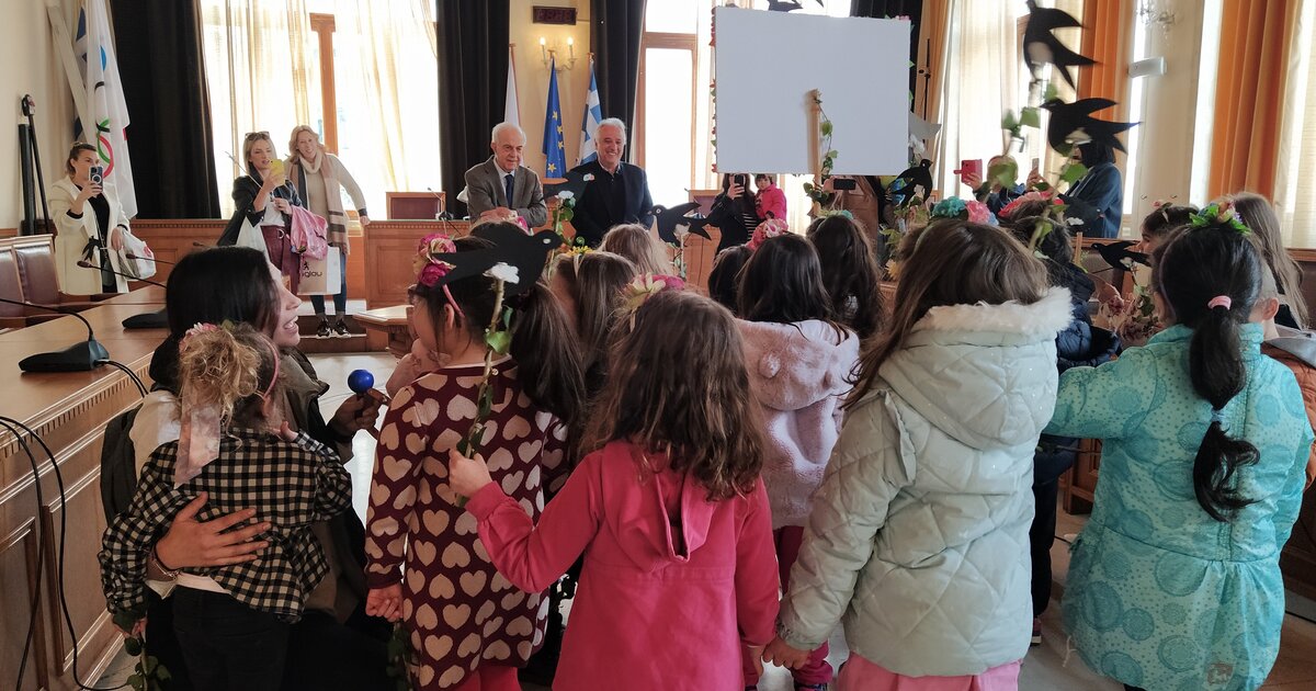 Τα παιδιά του Νηπιαγωγείου κρατώντας χάρτινα ομοίωματα λουλουδιών και χελιδονιών, τραγούδησαν την έλευση της άνοιξης ενώ ο Δήμαρχος τα ευχαρίστησε για την όμορφη ατμόσφαιρα που δημιούργησαν στη Λότζια