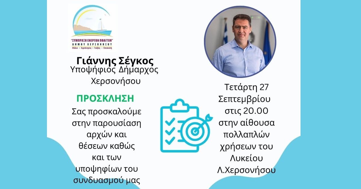 Η παρουσίαση αρχών και θέσεων καθώς και των υποψηφίων του συνδυασμού «Σύμπραξη Ενεργών Πολιτών Δήμου Χερσονήσου» του Γιάννη Σέγκου πραγματοποιείται την Τετάρτη 27 Σεπτεμβρίου στις 20.00 στην αίθουσα πολλαπλών χρήσεων του Λυκείου Χερσονήσου.