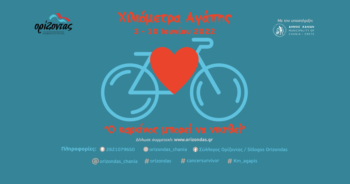 Ο Σύλλογος “Ορίζοντας” με αφορμή την Παγκόσμια Ημέρα Ποδηλάτου (3 Ιουνίου) και την Παγκόσμια Ημέρα Επιζώντων του Καρκίνου (1η Κυριακή του Ιουνίου) διοργανώνει και φέτος συμβολικό Ποδηλατικό Αγώνα σε virtual μορφή, για μικρούς και μεγάλους! Θα γιορτάσουμε όλοι μαζί, συγκεντρώνοντας όσα περισσότερα χιλιόμετρα αγάπης μπορούμε με τα ποδήλατά μας, διαδίδοντας το μήνυμα: “Ο καρκίνος μπορεί να νικηθεί!” και δίνοντας δύναμη σε όσους νοσούν και δίνουν το δικό τους καθημερινό αγώνα.