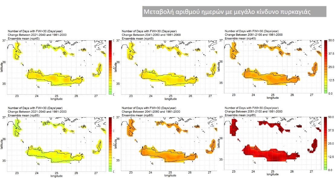 Η Κρήτη βιώνει την κλιματική αλλαγή, με τη θερμοκρασία να είναι η πιο άμεσα αισθητή συνέπεια. Μεγαλύτερη αναμένεται η αύξηση του αριθμού ημερών με την ελάχιστη θερμοκρασία να ξεπερνά τους 20o C (τροπικές νύχτες) κατά τις επόμενες δεκαετίες, κατά μέσο όρο από 25 ημέρες (δύο σενάρια, περίοδος 2021-2040) έως 80 ημέρες (δυσμενές σενάριο, περίοδος 2081-2100). Αυτό θα έχει συνέπεια την αύξηση του αριθμού ημερών ανά έτος με μεγάλη δυσφορία για τον πληθυσμό, λόγω μεταβολών θερμοκρασίας (σε συνδυασμό με μεταβολές στην υγρασία).