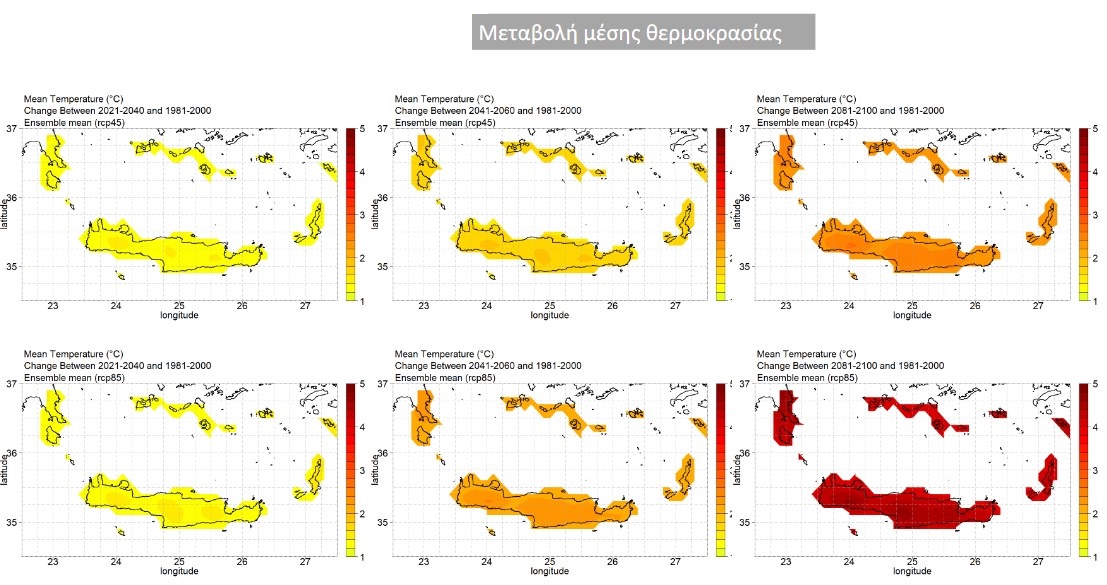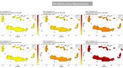 Πάντως οι εκτιμήσεις για τις κλιματικές μεταβολές στην Κρήτη είναι δυσοίωνες και δείχνουν ως μονόδρομο τον στρατηγικό σχεδιασμό για την προσαρμογή στα νέα κλιματικά δεδομένα. Σύμφωνα με τις εκτιμήσεις στο πλαίσιο του ΠΕΠΣΚΑ, αναμένεται άνοδος της μέσης θερμοκρασίας σε επίπεδο Περιφέρειας, σε όλα τα σενάρια και τις χρονικές περιόδους που μελετήθηκαν, εύξηση της μέσης θερμοκρασίας από 1,35oC έως 4,50oC, ελαφρώς μεγαλύτερες αυξήσεις στα εσωτερικά και ορεινά τμήματα & μικρότερες στα παραθαλάσσια.