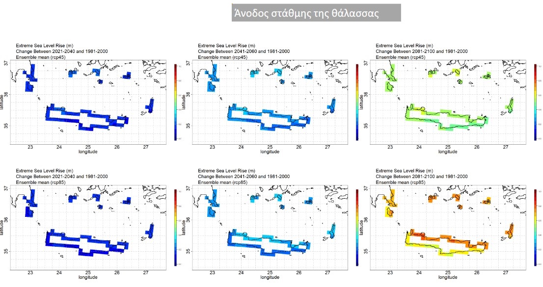 Τα κλιματικά δεδομένα που έχουν μελετηθεί και αποτελούν τη βάση για τις μελλοντικές προβλέψεις "δείχνουν" μελλοντική άνοδο της στάθμης της θάλασσας, με μέγιστη τιμή ανόδου από 15cm (περίοδος 2021-2040) έως 60-70 cm (μακροπρόθεσμα), στο ενδιάμεσο και δυσμενές σενάριο αντίστοιχα. Μεγαλύτερο κίνδυνο διατρέχουν οι παράκτιες περιοχές όλης της βόρειας Κρήτης (αυξήσεις > 0.75 m στο δυσμενές σενάριο κατά τον μακροπρόθεσμο χρονικό ορίζοντα).