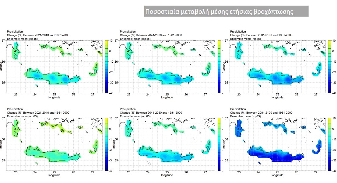 Παράλληλα, σταδιακά μειώνονται οι βροχοπτώσεις (στο ενδιάμεσο και στο δυσμενές σενάριο, με τη μεγαλύτερη μείωση της μέσης τιμής βροχόπτωσης στο σύνολο της Περιφέρειας να φτάνει (κατά το δυσμενές σενάριο) τα -187 mm (27%) την περίοδο 2081-2100. Ταυτόχρονα προβλέπεται αύξηση των συνεχόμενων ημερών χωρίς βροχόπτωση από 5 έως 25 περίπου ημέρες (δυσμενές σενάριο, περίοδος 2081-2100), καθώς και μεγαλύτερη μεταβολή των συνεχόμενων ξηρών ημερών στην Π.Ε. Ηρακλείου (30 μέρες/έτος, περίοδος 2081-2100).
