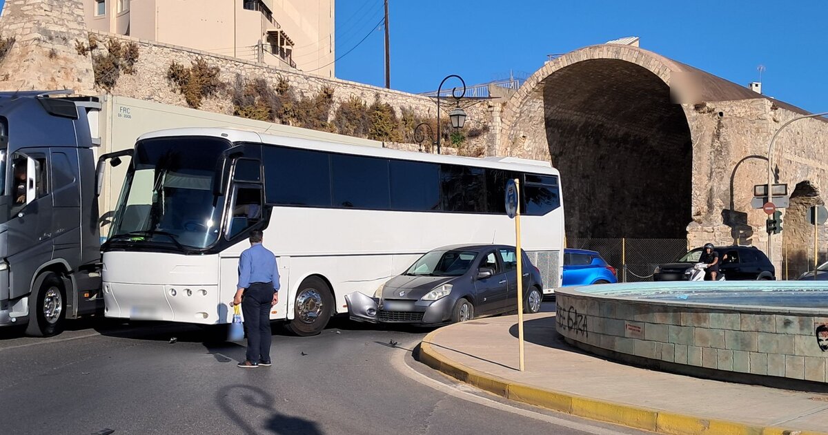 Δύο βαρέα οχήματα και ένα ΙΧ βρέθηκαν ταυτόχρονα σε κυκλικό κόμβο στην παραλιακή μετά από τροχαίο ατύχημα. Λίγο πριν τις 08.30 το πρωί, στον κυκλικό κόμβο στο ύψος των Νεωρίων, στο Ηράκλειο, σημειώθηκε ατύχημα με υλικές ζημιές μεταξύ τουριστικού λεωφορείου και ΙΧ, ενώ ο φωτογραφικός φακός αποτύπωσε τα τρία οχήματα ταυτόχρονα σε σημείο με δύο λωρίδες κυκλοφορίας.