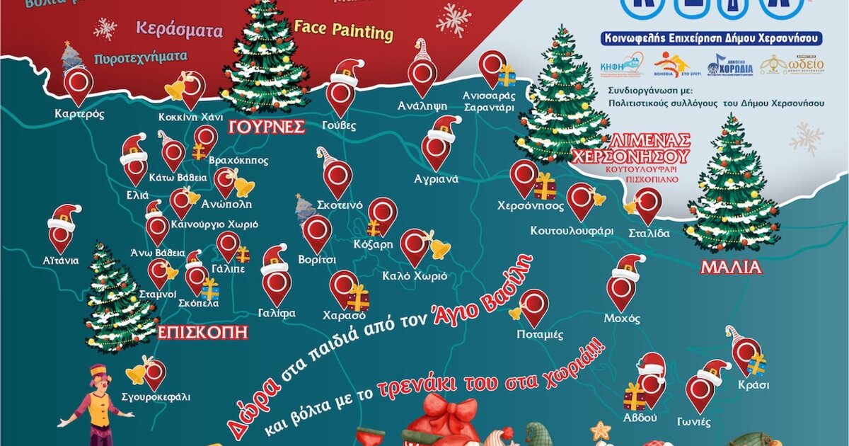 Στις υπόλοιπες εορταστικές εκδηλώσεις, στα χωριά του Δήμου Χερσονήσου, την ατμόσφαιρα των γιορτών θα μεταφέρει το τρενάκι του Αϊ Βασίλη, το οποίο θα σκορπίζει δώρα, μουσική και χαρά στα παιδιά από τις 17:00 έως τις 19:00 μέχρι και την Κυριακή 26 Δεκεμβρίου.