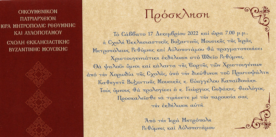 Το Σάββατο 17 Δεκεμβρίου στις 19.00 η Σχολή Εκκλησιαστικής βυζαντινής Μουσικής της ιερές Μητροπόλεως Ρεθύμνης και Αυλοποτάμου θα πραγματοποιήσει Χριστουγεννιάτικη εκδήλωση στο Ωδείο Ρεθύμνης.