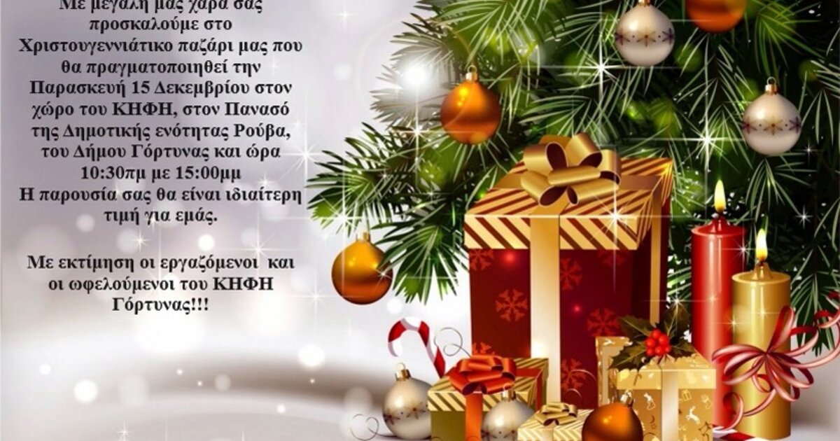 Χριστουγεννιάτικο παζάρι με πρωτότυπες δημιουργίες διοργανώνεται την Παρασκευή στο Κέντρο Ημερήσιας Φροντίδας Ηλικιωμένων (ΚΗΦΗ) Πανασούστο Κέντρο Ημερήσιας Φροντίδας Ηλικιωμένων (ΚΗΦΗ στον δήμο Γόρτυνας.