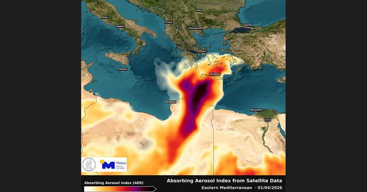 Αξιοποιώντας δορυφορικά δεδομένα του Sentinel-5P του Ευρωπαϊκού προγράμματος Copernicus, από την ομάδα του Meteo (Κ. Λαγουβάρδος, Χ. Γιαννακλής και Γ. Κύρος) παρουσιάζεται στον παρακάτω χάρτη ο δείκτης Aerosol Index (AER) πάνω από την Ανατολική Μεσόγειο την Τετάρτη 01 Απριλίου 2026, λίγο πριν την κορύφωση του επεισοδίου!