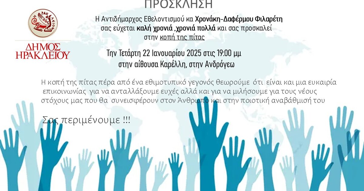 Η Αντιδημαρχία Εθελοντισμού του Δήμου Ηρακλείου απευθύνει πρόσκληση σε Εθελοντικές ομάδες και πολίτες να παραβρεθούν στην κοπή της Πρωτοχρονιάτικης πίτας, την Τετάρτη 22 Ιανουαρίου 2025 στις 19:00 το απόγευμα στην αίθουσα «Μ. Καρέλλης» στο κτίριο της οδού Ανδρόγεω.
