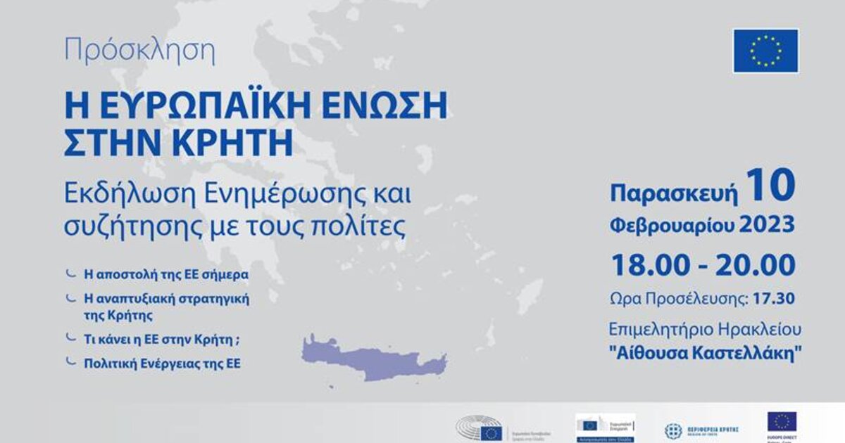 Ανοικτή εκδήλωση ενημέρωσης και συζήτησης με τους πολίτες με θέμα «Η Ευρωπαϊκή Ένωση στην Κρήτη» συνδιοργανώνουν την Παρασκευή 10 Φεβρουαρίου 2023 στο Επιμελητήριο Ηρακλείου, «Αίθουσα Καστελλάκη», το Γραφείο του Ευρωπαϊκού Κοινοβουλίου και η Αντιπροσωπεία της Ευρωπαϊκής Επιτροπής στην Ελλάδα με τη συνεργασία της Περιφέρειας Κρήτης και του Europe Direct Κρήτης.