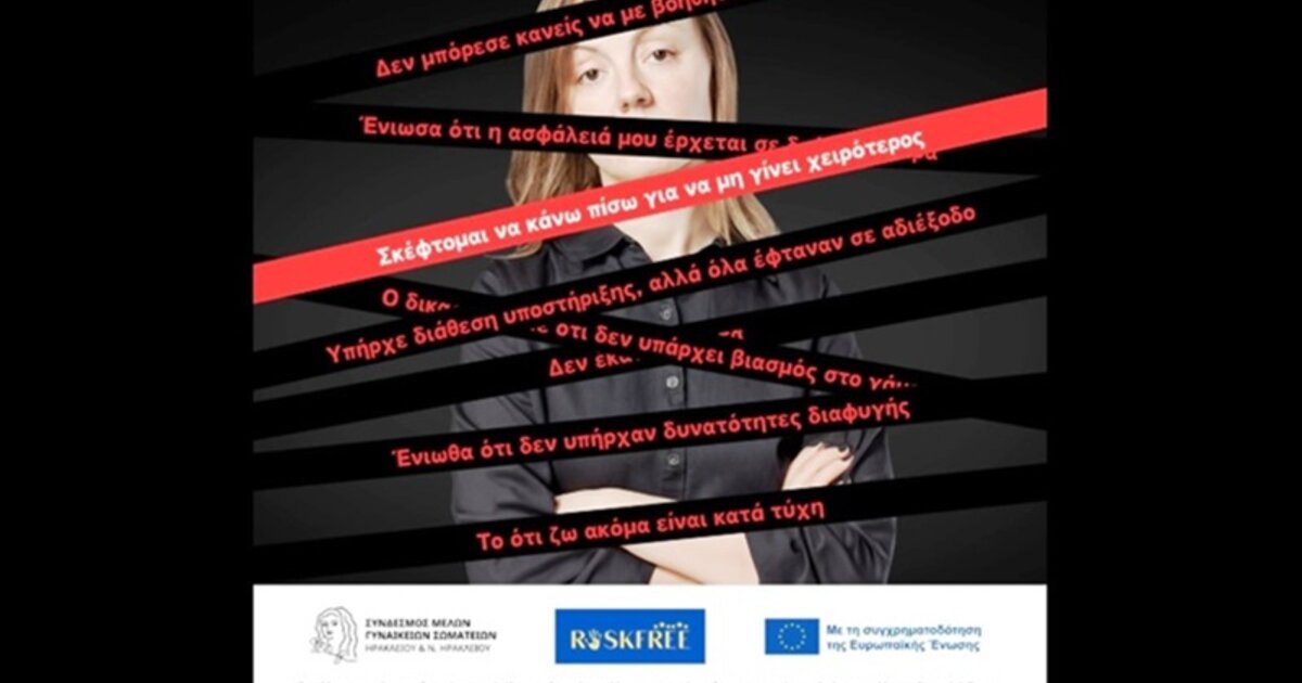 Ο «Σύνδεσμος Μελών Γυναίκειων Σωματείων Ηρακλείου και Ν. Ηρακλείου», με αφορμή την ολοκλήρωση του Ευρωπαϊκού Έργου «RiskFree» στο οποίο συμμετείχε, θέλει να αναδείξει τη φωνή των γυναικών που βίωσαν κακοποίηση και απευθύνθηκαν στις Υπηρεσίες Υποστήριξης, εκπέμποντας το μήνυμα «ΑΚΟΥΣΕ – ΑΞΙΟΛΟΓΗΣΕ – ΔΡΑΣΕ»