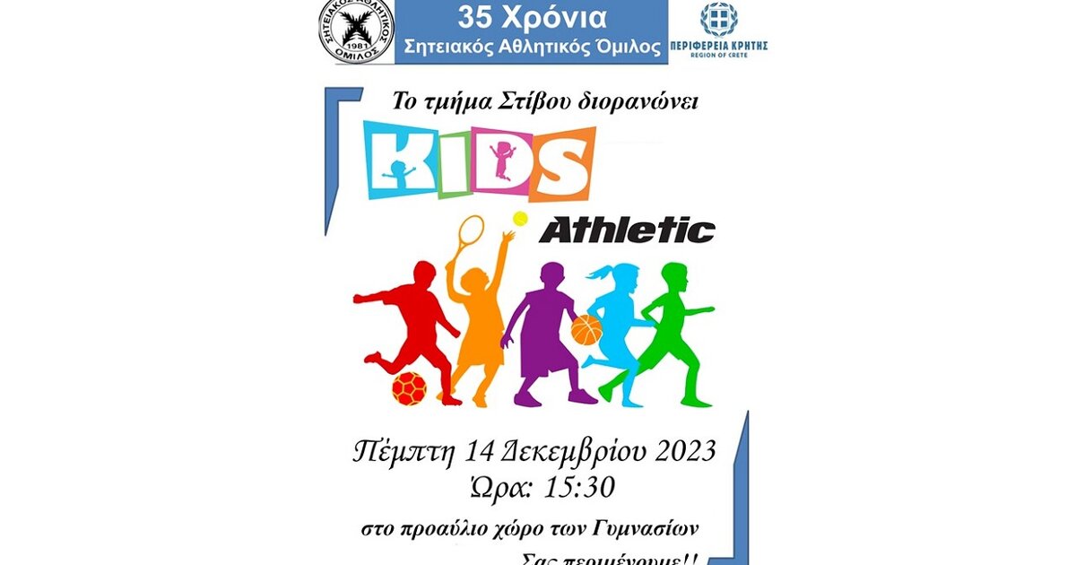 Ο Σητειακός Α.Ο. με την υποστήριξη της Περιφέρειας Κρήτης διοργανώνει σήμερα Πέμπτη 14 Δεκεμβρίου και ώρα 15:30 στον προαύλιο χώρο των γυμνασίων Σητείας τη «γιορτή στίβου νέων».