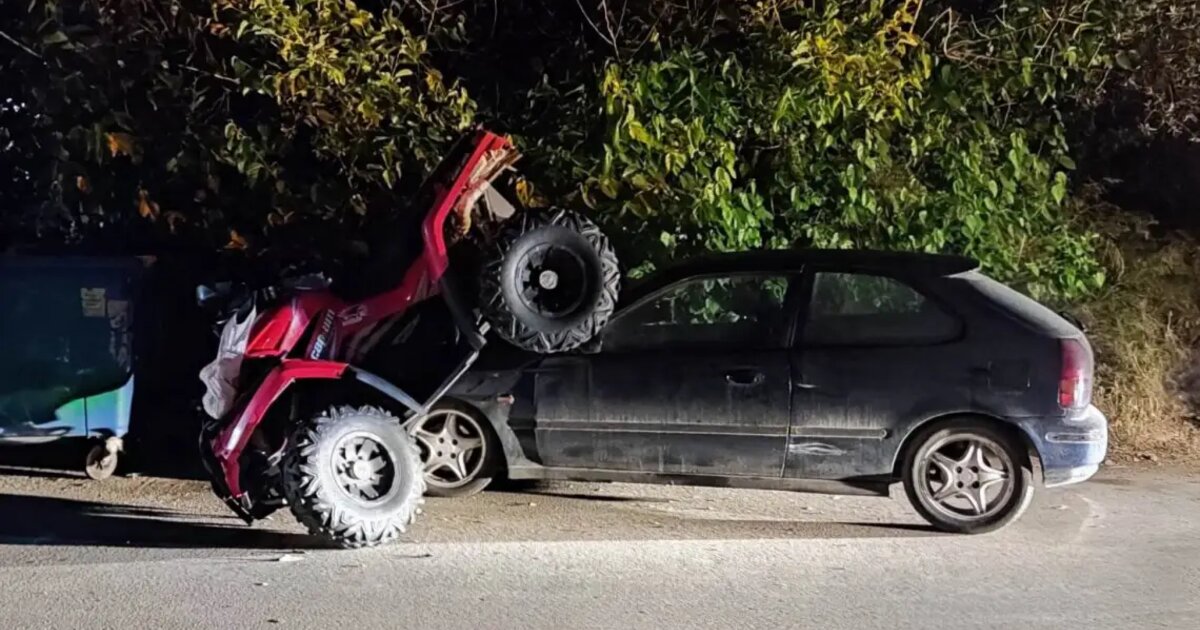 Το τροχαίο, σύμφωνα με το parakritika.gr, σημειώθηκε επί της οδού Πλαστήρα, όταν κάτω από αδιευκρίνιστες συνθήκες, ένα τετράτροχο όχημα τύπου γουρούνα, συγκρούστηκε με ένα αυτοκίνητο και στη συνέχεια κατέληξε στο καπό ενός δεύτερου αυτοκινήτου!