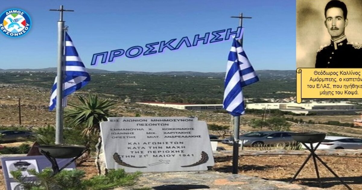 Ο Δήμος Χερσονήσου, με αφορμή τις προγραμματισμένες εκδηλώσεις εθνικού χαρακτήρα για την επέτειο της Μάχης της Κρήτης, σε συνεργασία με την Ενορία Ταξιαρχών Ανώπολης και τους Πολιτιστικούς Συλλόγους της περιοχής – τον Εκπολιτιστικό & Εξωραϊστικό Σύλλογο Ανωπόλεως, τον Πολιτιστικό Σύλλογο Γουρνών και το Πολιτιστικό Πνευματικό Κέντρο «΄Αξιον Εστί» Κοκκίνη Χάνι, τιμούν την ιστορική «ΜΑΧΗ ΤΟΥ ΚΟΨΑ» και πραγματοποιούν εκδηλώσεις μνήμης και απόδοσης φόρου τιμής την Παρασκευή 20 Μαΐου 2022, σύμφωνα με τις ισχύουσες υγειονομικές διατάξεις.