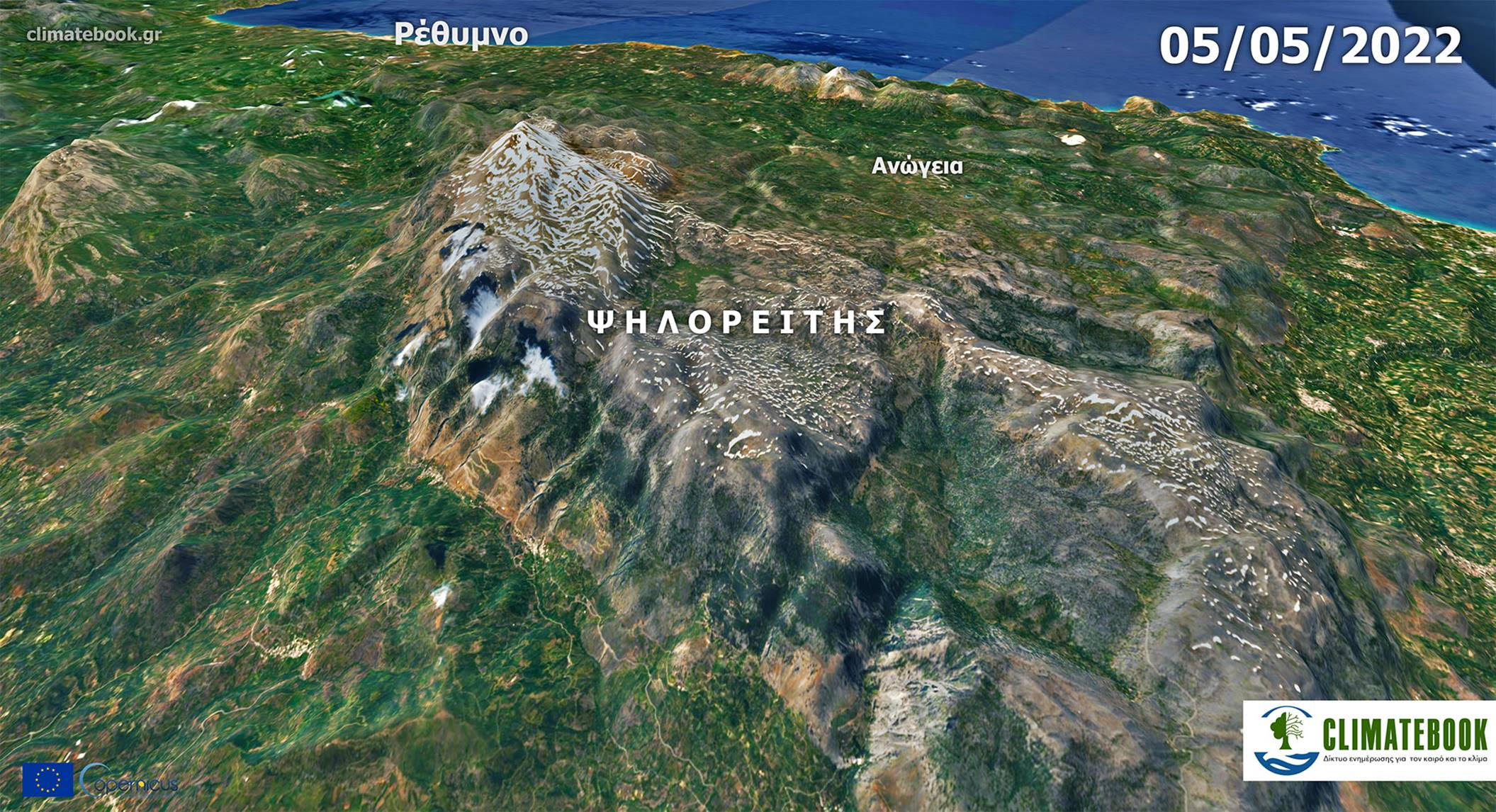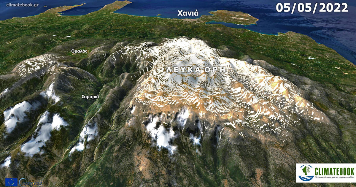 Το climatebook παρουσιάζει δύο δορυφορικές φωτογραφίες οι οποίες κατέγραψαν με πολύ υψηλή ανάλυση τη χιονοκάλυψη στα Λευκά Όρη και στον Ψηλορείτη στις 5 Μαίου 2022.