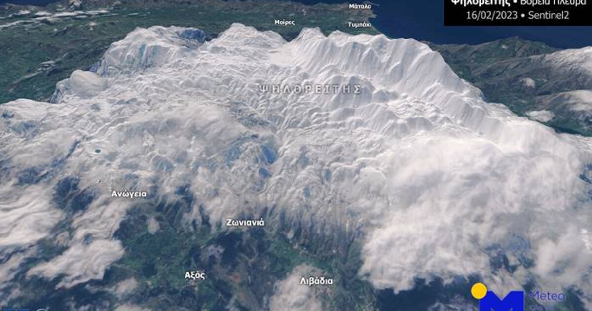 Οι ανέφελες συνθήκες στην Κρήτη την Πέμπτη 16/02 επέτρεψαν την δορυφορική αποτύπωση της χιονόπτωσης στα βουνά της, μετά την κακοκαιρία «Βαρβάρα».