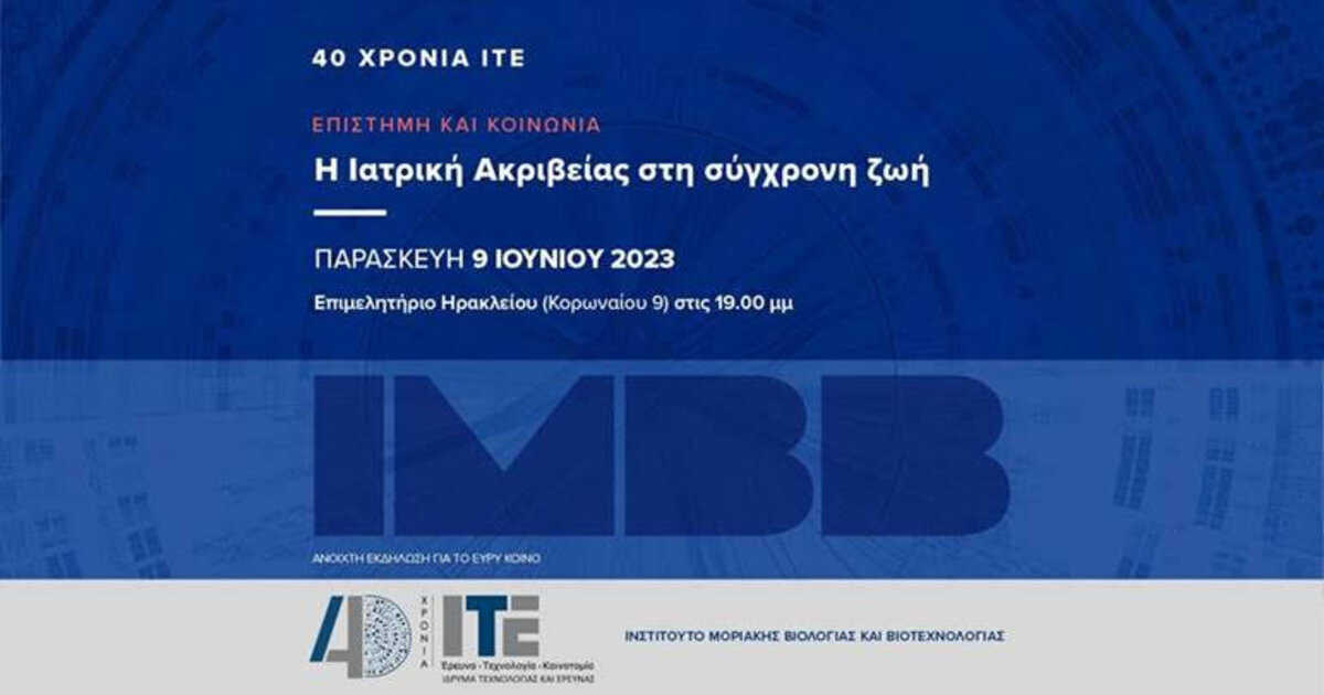 Στο πλαίσιο του εορτασμού των 40 χρόνων από την ίδρυση του Ιδρύματος Τεχνολογίας και Έρευνας (ΙΤΕ), το Ινστιτούτο Μοριακής Βιολογίας και Βιοτεχνολογίας του ΙΤΕ σας προσκαλεί στην ανοιχτή εκδήλωση που διοργανώνει για το ευρύ κοινό με θέμα: «Η Ιατρική Ακριβείας στη σύγχρονη ζωή», την Παρασκευή 9 Ιουνίου 2023 στις 19.00 μμ. στο Επιμελητήριο Ηρακλείου, Αίθουσα Καστελλάκη (Κορωναίου 9).