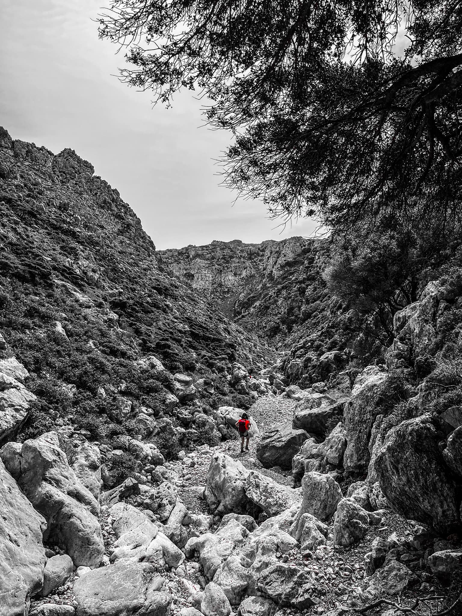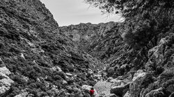 Το φαράγγι κοντά στο χωριό είναι μια πράσινη ρεματιά με πολλά χόρτα, χαρά για τους «χορτοσυλλέκτες» της ομάδας (ο φίλος μου, ο Γιάννης Παλαμάς μου δείχνει πώς να εντοπίζω, να καθαρίζω αλλά και να μαγειρεύω τις αγριαγκινάρες). Έπειτα μετατρέπεται σε μια ξερική κι άνυδρη κοιλάδα με φρύγανα δίπλα στα οποία ξεπετάγονται μικροσκοπικά λουλουδάκια της εποχής: ίριδες, ορχιδέες, ανεμώνες, κρινάκια. Στο τέλος του στενεύει κι αγριεύει με κάθετα βράχια, καλυμμένα με πουρνάρια σε αρκετά σημεία και θέλει προσοχή για το καλύτερο δυνατό πέρασμα. Οι κολύμπες με νερό στο κοκκινόχωμα σε συνδυασμό με το σκαρφάλωμα στις γλιστερές πέτρες αυξάνουν το βαθμό δυσκολίας και κάνουν την ομάδα πιο αργή. Η πιθανότητα να είμαστε στην ώρα μας με την έναρξη των δραστηριοτήτων στο Καρύδι ολοένα κι απομακρύνεται. Ένα μικρό ατύχημα στον φίλο μας, τον Γιώργο, -ευτυχώς όχι πολύ σοβαρό, όπως αποδείχτηκε, και περαστικά του!- μας κάνει ακόμα πιο προσεκτικούς! Μεγάλη επιβράβευση ωστόσο τα ποικίλα χρώματα των πετρωμάτων προς την έξοδο, κοντά στο χωριό Αδραβάστοι, που μας θυμίζει ότι είμαστε στα όρια του Παγκόσμιου Γεωπάρκου Unesco της Σητείας.