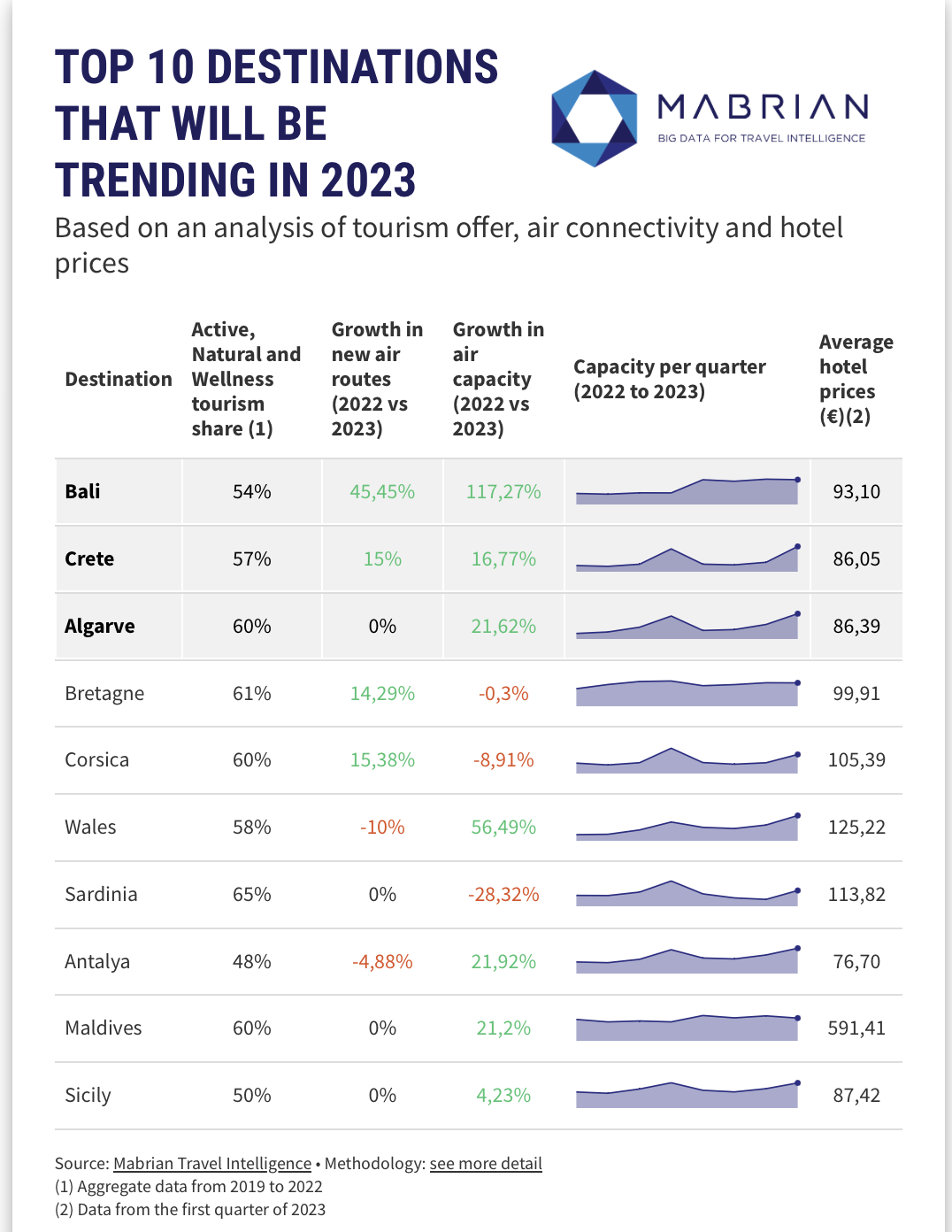 Έχοντας επιβεβαιώσει αυτήν την παγκόσμια τάση, η Mabrian ανακάλυψε ποιοι προορισμοί στον κόσμο είναι οι καλύτεροι για να είναι στη μόδα το 2023 χάρη στο μείγμα τουριστικών προϊόντων που προσφέρουν, την αεροπορική συνδεσιμότητα και την προσφορά ξενοδοχειακών καταλυμάτων.