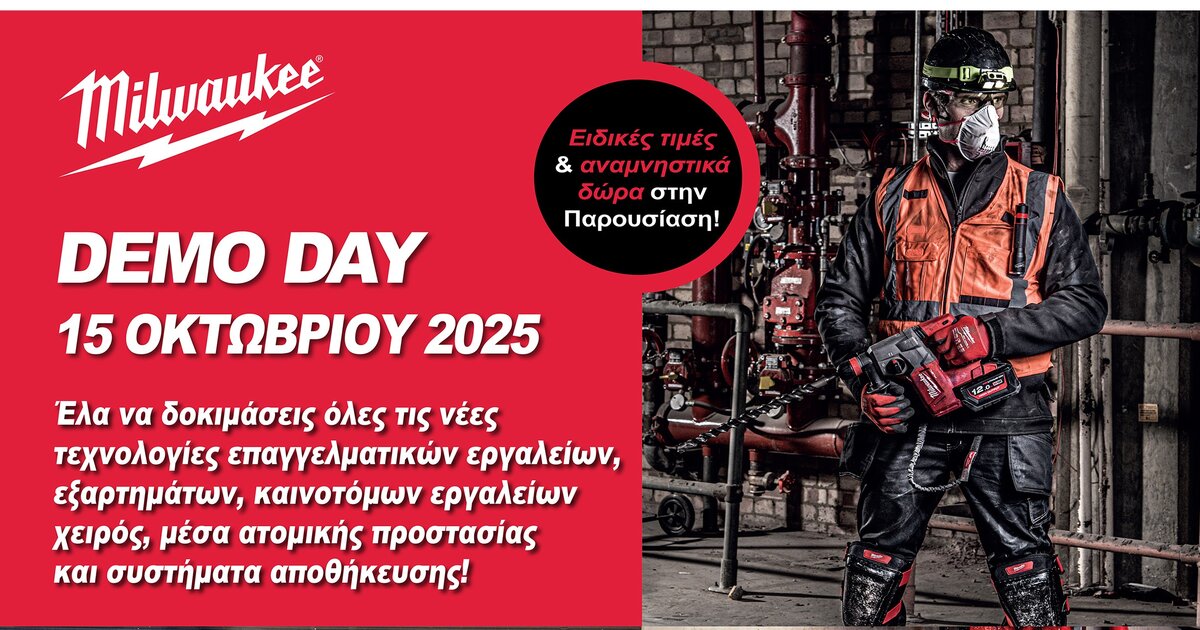 "Την Τετάρτη 15 Οκτωβρίου, το κατάστημά μας θα φιλοξενήσει το επίσημο Demo Day της Milwaukee Tools, του παγκόσμιου ηγέτη στα επαγγελματικά εργαλεία βαρέως τύπου.
