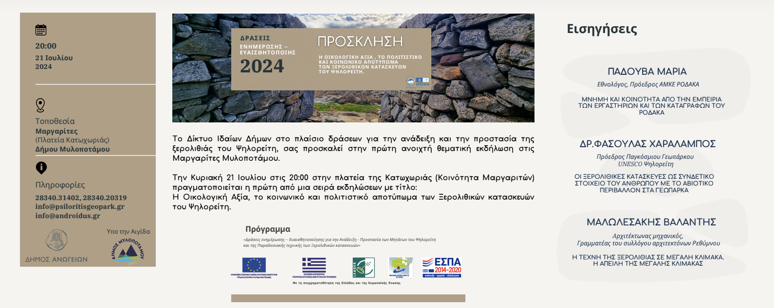 Το Δίκτυο Ιδαίων Δήμων στο πλαίσιο δράσεων για την ανάδειξη και την προστασία της ξερολιθιάς του Ψηλορείτη, σας προσκαλεί στην πρώτη ανοιχτή θεματική εκδήλωση στις Μαργαρίτες Μυλοποτάμου.