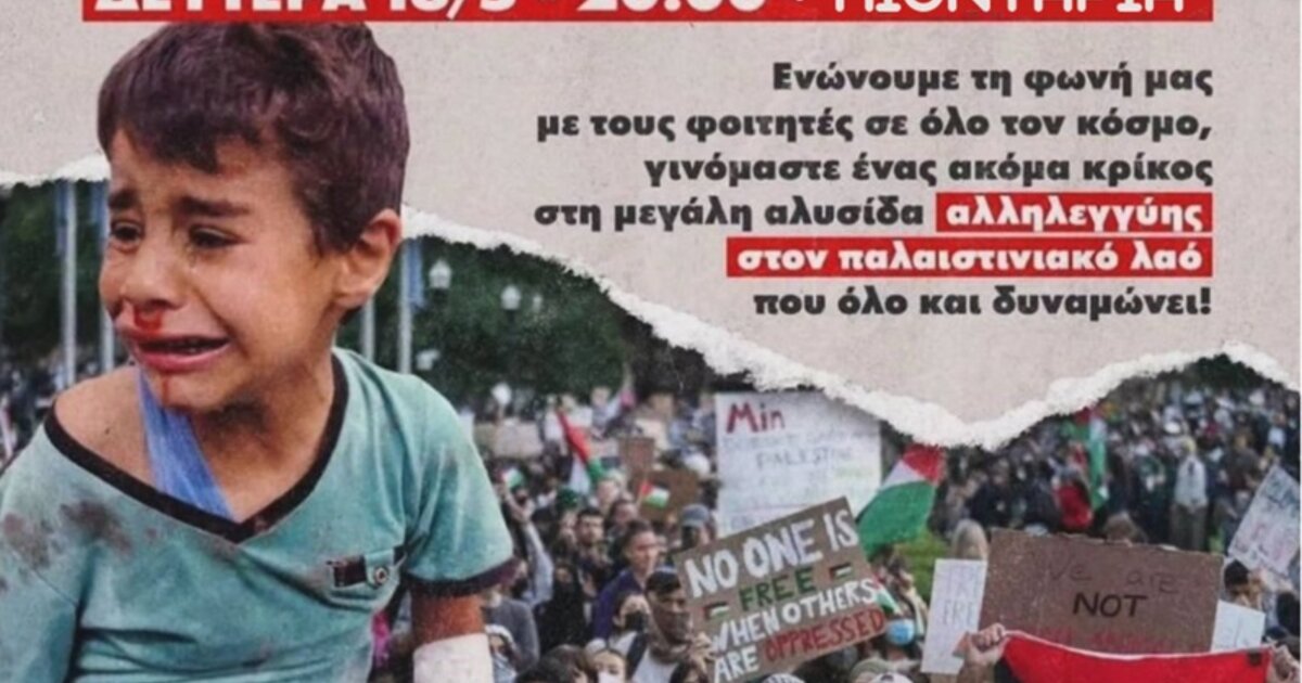 "H Ομοσπονδία Γυναικών Ελλάδας (ΟΓΕ) χαιρετίζει τις μαζικές και δυναμικές κινητοποιήσεις αλληλεγγύης στον Παλαιστινιακό λαό των φοιτητών που κινητοποιούνται στις ΗΠΑ, τη Γαλλία, τη Μεγάλη Βρετανία και σε πολλές ακόμα χώρες του κόσμου. Στεκόμαστε στο πλευρό τους καταδικάζοντας την άγρια καταστολή σε βάρος τους και τις οργανωμένες προσπάθειες συκοφάντησης του αγώνα τους από τις κυβερνήσεις. Καλούμε τις γυναίκες να συμμετέχουν μαζικά στο συλλαλητήριο που οργανώνουν οι φοιτητικοί σύλλογοι τη Δευτέρα 13 Μάη στα Λιοντάρια στο Ηράκλειο στις 8μ.μ.