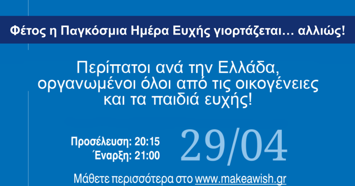 Το Make-A-Wish (Κάνε-Μια-Ευχή Ελλάδος) ανήμερα της 29ης Απριλίου, με ώρα συγκέντρωσης 20:15, διοργανώνει τον καθιερωμένο ετήσιο περίπατο, Walk for Wishes 2024, σε Αθήνα, Θεσσαλονίκη… και όχι μόνο! Φέτος, με πρωτοβουλία οικογενειών παιδιών ευχής ο περίπατος θα διεξαχθεί και σε άλλες πόλεις ανά την Ελλάδα, όπως στο Ηράκλειο και τα Χανιά. Oι περίπατοι θα είναι βραδινοί ώστε να φωτίσουμε τον ελληνικό ουρανό, από άκρη σε άκρη, στο μπλε χρώμα του Make-A-Wish με ειδικά φαναράκια και φωταγωγήσεις, ενώ τις πορείες θα οδηγήσουν παιδιά ευχής και οι οικογένειές τους. Με τους συμβολικούς αυτούς περίπατους θα τιμήσουμε τα παιδιά ευχής που πάλεψαν με μία σοβαρή ασθένεια και έγιναν καλά, ή που εξακολουθούν να παλεύουν, αλλά και τη μνήμη εκείνων που φώτισαν το δρόμο μας.