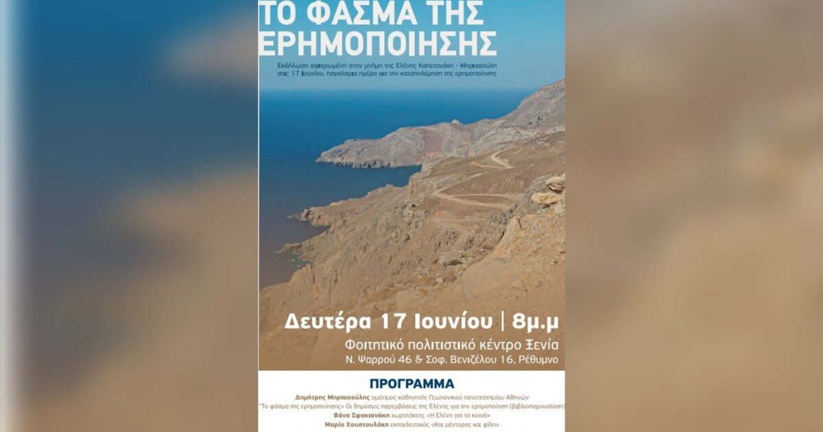 Η εκδήλωση θα λάβει χώρα την προσεχή Δευτέρα 17 Ιουνίου στις 8.00 μ.μ. στο Φοιτητικό Πολιτιστικό Κέντρο Ξενία (Ν. Ψαρρού 46) στο Ρέθυμνο.
