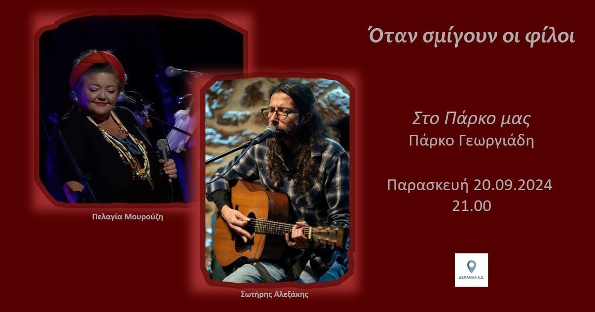 «Όταν σμίγουν οι φίλοι» είναι ο τίτλος μιας μουσικής βραδιάς που διοργανώνει η ΔΕΠΑΝΑΛ Α.Ε. στο αναψυκτήριο «Το Πάρκο μας», στο Πάρκο Γεωργιάδη.