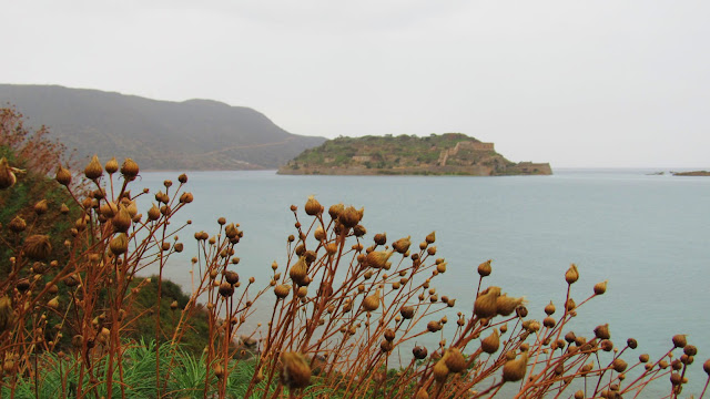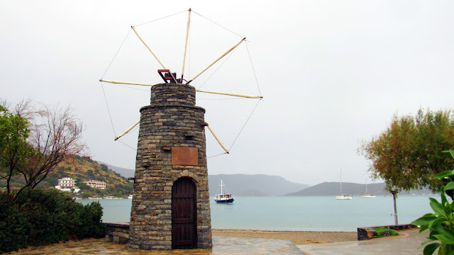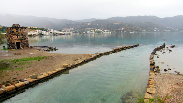 Μ’ αυτά και μ’ αυτά παίρνει ώρα να φτάσουμε στην άλλη άκρη της Ελούντας, μιας τουριστικής κωμόπολης-φάντασμα τους χειμωνιάτικους μήνες κι η βροχή δυναμώνει. Η πραγματική πεζοπορία τώρα αρχίζει. Περνάμε και την άλλη ‘βλυχάδα’ και παίρνουμε το παραλιακό μονοπάτι για τους τουρίστες, δίπλα στον αυτοκινητόδρομο. Αέρας δεν φυσά, η θάλασσα έχει πήξει. Γραφικές βαρκούλες αραγμένες μέσα στα μικρά κανάλια. Μεγαλύτερα καΐκια, που σίγουρα μεταφέρουν τους τουρίστες στη Σπιναλόγκα το καλοκαίρι, τώρα ξεκουράζονται στις δέστρες τους. Στο βάθος η χερσόνησος της Κολοκύθας καταπράσινη λόγω της εποχής. Ομορφιά!!!
