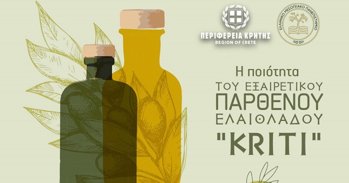 Η Περιφέρεια Κρήτης και το Ελληνικό Μεσογειακό Πανεπιστήμιο, σε συνεργασία με το Δήμο Αγίου Βασιλείου, διοργανώνουν εσπερίδα για την ποιότητα του Εξαιρετικού Παρθένου Ελαιόλαδου “Kriti” η οποία θα πραγματοποιηθεί την Πέμπτη 1 Αυγούστου 2024, στις 17:00μ.μ., στην αίθουσα εκδηλώσεων στο δημαρχείο Σπηλίου. Την εκδήλωση υποστηρίζουν οι: Σύνδεσμος Εξαγωγέων Κρήτης, Σύνδεσμος Τυποποιητών Ελαιολάδου Κρήτης, Σύνδεσμος Ελαιοκομικών Δήμων Κρήτης, Δίκτυο Κρητικού Ελαιολάδου, Σύνδεσμος Ελαιουργών Ν. Ηρακλείου.