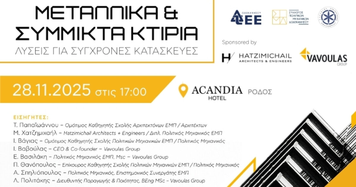 Οι εταιρείες Vavoulas Group [turn key construction] και Hatzimichail Architects + Engineers συμμετέχουν ως χορηγοί στην εσπερίδα που διοργανώνει το Τεχνικό Επιμελητήριο Ελλάδος – Τμήμα Δωδεκανήσου σε συνεργασία με τον Σύλλογο Πολιτικών Μηχανικών Δωδεκανήσου & τον Σύλλογο Αρχιτεκτόνων Δωδεκανήσου με τίτλο «Mεταλλικά & σύμμικτα κτίρια - Λύσεις για σύγχρονες κατασκευές»,, η οποία θα πραγματοποιηθεί στη Ρόδο, την Παρασκευή 28 Νοεμβρίου 2025, στις 17:00, στο ξενοδοχείο Acandia.