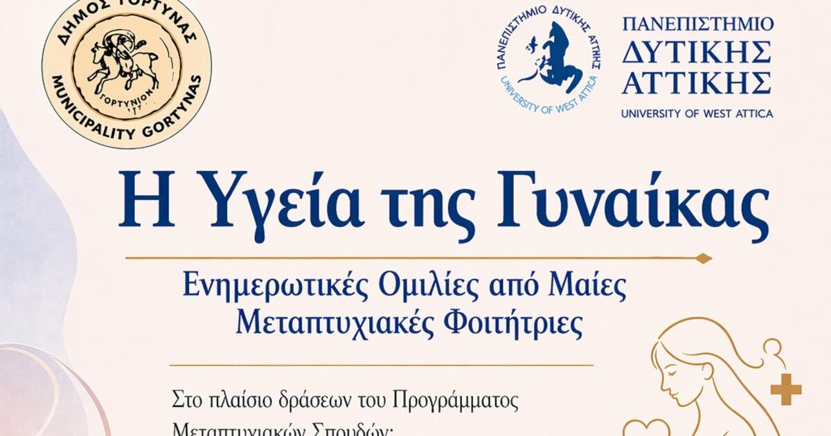 Η υγεία της γυναίκας και η κοινωνία του μέλλοντος θα βρεθούν στο επίκεντρο ημερίδας που θα διεξαχθεί την Κυριακή 3 Μαΐου 2026 (ώρα 11:30), στην Αίθουσα Πνευματικού Κέντρου Ι.Ν. Αγίας Βαρβάρας, στην δημοτική κοινότητα Αγίας Βαρβάρας, στο πλαίσιο συνεργασίας του Πανεπιστημίου Δυτικής Αττικής με τον Δήμο Γόρτυνας, με στόχο την προαγωγή της υγείας, της πρόληψης, της ενημέρωσης και ευαισθητοποίησης του κοινού.