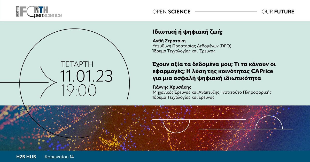 Η υπεύθυνη Προστασίας Δεδομένων του ΙΤΕ Ανθή Στρατάκη και ο Μηχανικός Έρευνας και Ανάπτυξης, Γιάννης Χρυσάκης θα ενημερώσουν για τους τρόπους με τους οποίους μπορούμε να προασπίσουμε το δικαίωμά μας στην ιδιωτική ζωή.