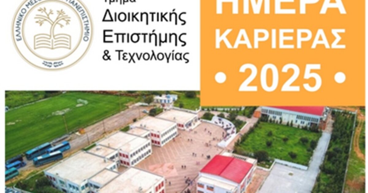 Το Τμήμα Διοικητικής Επιστήμης και Τεχνολογίας του Ελληνικού Μεσογειακού Πανεπιστημίου διοργανώνει την Ημέρα Καριέρας 2025 την Παρασκευή 5 Δεκεμβρίου 2025, στις 11:00, στις εγκαταστάσεις του Τμήματος στον Άγιο Νικόλαο.
