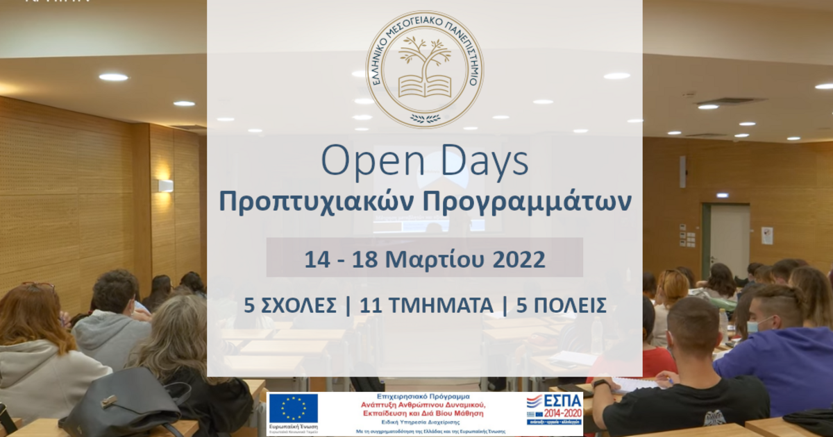 Η εκδήλωση «Open Days» θα πραγματοποιηθεί από τη Δευτέρα 14 έως και την Παρασκευή 18 Μαρτίου 2022. Στη διάρκεια αυτής της εβδομάδας οι ενδιαφερόμενοι θα έχουν την ευκαιρία να επισκεφθούν τα διάφορα Τμήματα του Ελληνικού Μεσογειακού Πανεπιστημίου για τα οποία ενδιαφέρονται και να συμμετέχουν σε δράσεις που έχουν προγραμματιστεί από το κάθε Τμήμα ξεχωριστά.