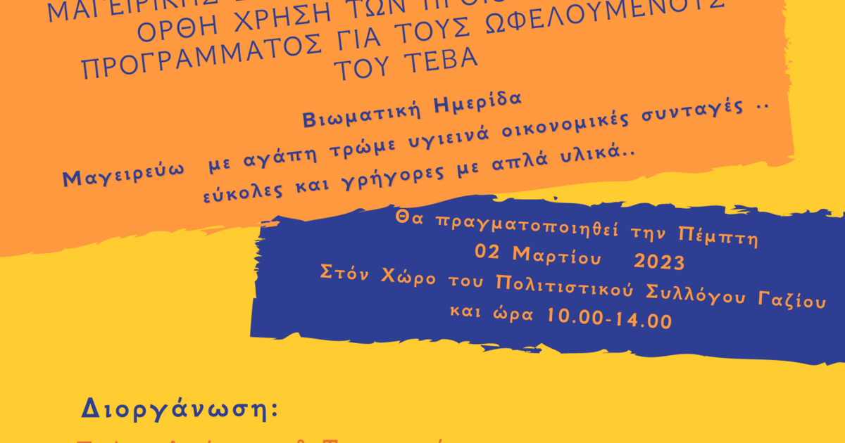 Η ημερίδα θα πραγματοποιηθεί στο χώρο του Πολιτιστικού Συλλόγου Γαζίου στις 10.00 το πρωί με την υποστήριξη του Κέντρου Κοινότητας του ΔΟΚΑΠΠΑΜ και το Τμήμα Κοινωνικής Προστασίας του Δήμου Μαλεβιζίου.