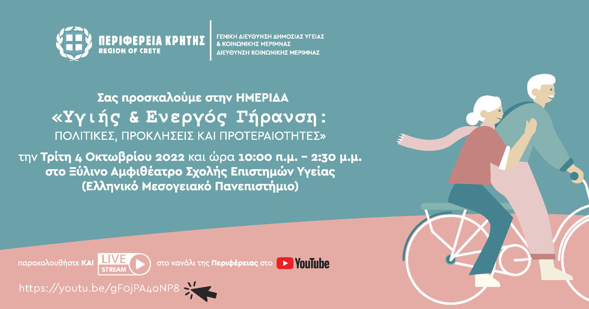 Η Περιφέρεια Κρήτης-Διεύθυνση Κοινωνικής Μέριμνας, υλοποιεί, με αφορμή την Παγκόσμια Ημέρα Τρίτης Ηλικίας, την ημερίδα με θέμα: «Υγιής και Ενεργός Γήρανση: Πολιτικές, Προκλήσεις και Προτεραιότητες», την Τρίτη, 4 Οκτωβρίου 2022 και ώρα 10:00 π.μ. έως 2:30μ.μ., στο Ξύλινο Αμφιθέατρο της Σχολής Επιστημών Υγείας του Ελληνικού Μεσογειακού Πανεπιστημίου, με τη συμμετοχή ακαδημαϊκών, επιστημόνων υγείας και κοινωνικής φροντίδας, ερευνητών/-τριών και στελεχών κοινωνικών υπηρεσιών.