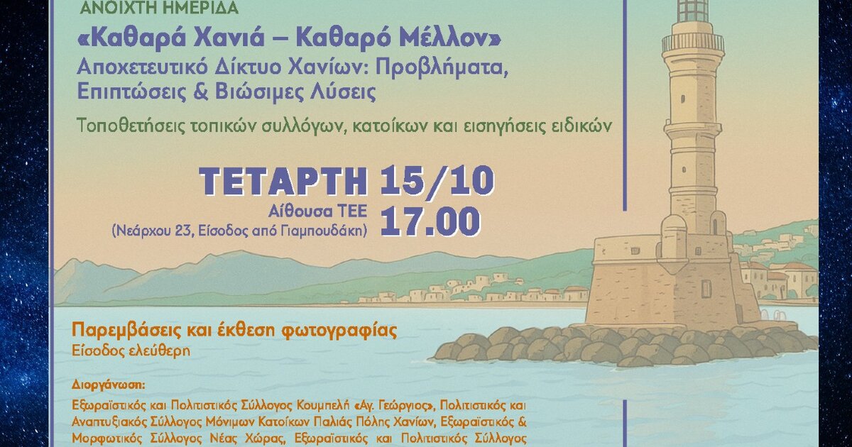 Η ημερίδα με τίτλο «Καθαρά Χανιά – Καθαρό Μέλλον / Αποχετευτικό Δίκτυο Χανίων – Προβλήματα, Επιπτώσεις & Βιώσιμες Λύσεις», η οποία θα πραγματοποιηθεί την Τετάρτη 15 Οκτωβρίου και ώρα 17:00 στην αίθουσα του ΤΕΕ Δυτικής Κρήτης (Νεάρχου 23, Είσοδος από Γιαμπουδάκη), έχει ως στόχο την έναρξη ενός εποικοδομητικού και τεκμηριωμένου διαλόγου σχετικά με: