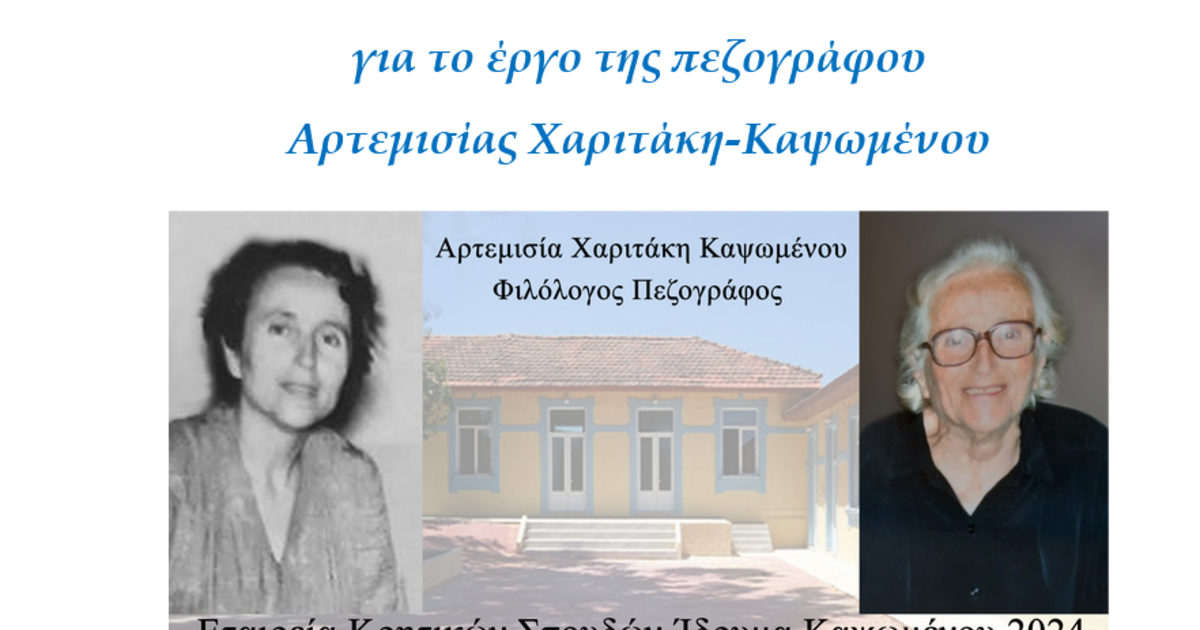 Η Εταιρεία Κρητικών Σπουδών – ‘Ιδρυμα Γεωργίου και Αρτεμισίας Καψωμένου και η Ένωση Πολιτιστικών Φορέων Επαρχίας Κισάμου (ΕΠΟΦΕΚ) οργανώνουν στην έδρα της Εταιρείας Κρητικών Σπουδών, τον Πύργο Αλικιανού, την Κυριακή, 15 Σεπτεμβρίου 2024, ώρα 18.00 - 21.45΄, στο πλαίσιο του Έτους Μνήμης και Τιμής στους Κτήτορες του Ιδρύματος Καψωμένου, ημερίδα για το έργο της πεζογράφου του Μεσοπολέμου, Αρτεμισίας Χαριτάκη – Καψωμένου, συνεχίζοντας τη Σειρά «Πεζογραφία της εντοπιότητας», που έχει στόχο να κάμει γνωστούς στο ευρύτερο κοινό τους συγγραφείς που το έργο τους συνιστά αξιόπιστο φορέα της ελληνικής πολιτισμικής παράδοσης.