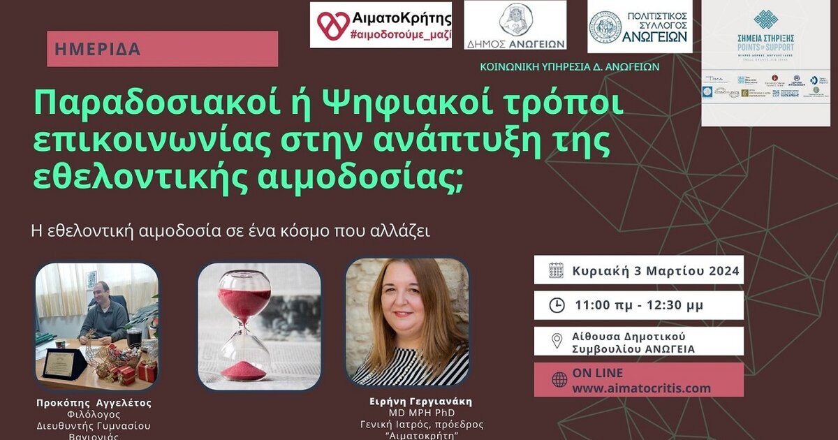 Ημερίδα με τίτλο "Η εθελοντική αιμοδοσία σε ένα κόσμο που αλλάζει: παραδοσιακοί ή οι ψηφιακοί τρόποι επικοινωνίας" θα πραγματοποιηθεί την Κυριακή 3 Μαρτίου 2024 στα Ανώγεια (αίθουσα Δημοτικού Συμβουλίου Δ. Ανωγείων) στις 11:00-12:30μμ με δυνατότητα διαδικτυακής παρακολούθησης.