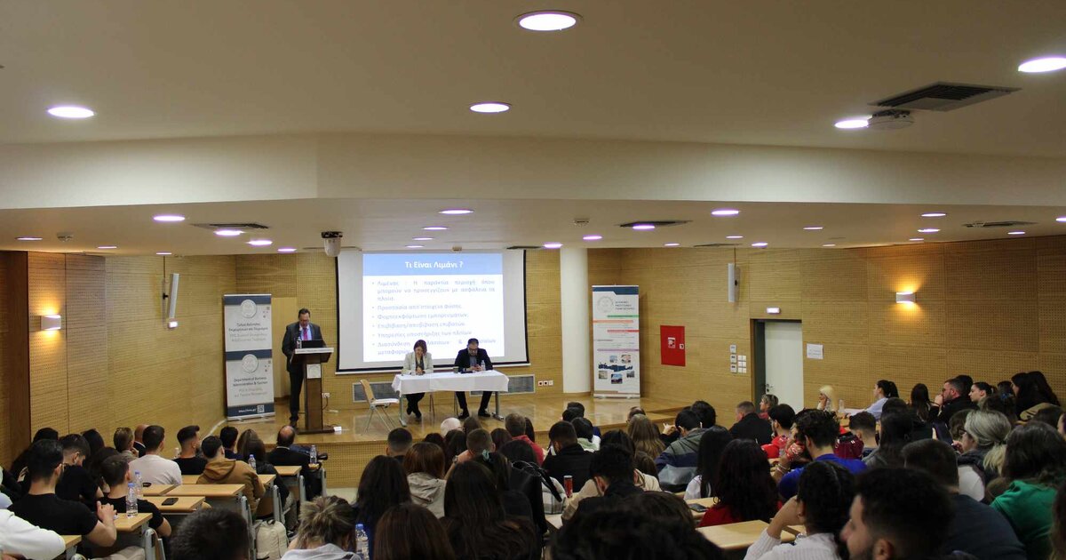 Σε ένα κατάμεστο αμφιθέατρο πραγματοποιήθηκε την Πέμπτη 28 Μαρτίου 2024 η 1η Ημερίδα για τον Ναυτιλιακό Κλάδο και τις Προοπτικές Σταδιοδρομίας που διοργάνωσε το Τμήμα Διοίκησης Επιχειρήσεων και Τουρισμού του Ελληνικού Μεσογειακού Πανεπιστημίου. Ο Γενικός Γραμματέας Αιγαίου και Νησιωτικής Πολιτικής κ. Εμμανουήλ Κουτουλάκης παρουσίασε στους φοιτητές και τις φοιτήτριες του Τμήματος τα δεδομένα και τις προοπτικές για την ελληνική ναυτιλία, ενώ διακεκριμένα στελέχη και ακαδημαϊκοί ανέλυσαν τη συμβολή του κλάδου στην ελληνική οικονομία, τις ιδιαιτερότητες και τις προκλήσεις του. Την Ημερίδα χαιρέτισαν η πρόεδρος του Τμήματος, αναπληρώτρια καθηγήτρια κα Ειρήνη Δήμου και ο αντιπρύτανης του ΕΛΜΕΠΑ κ Φώτης Μαυροματάκης.
