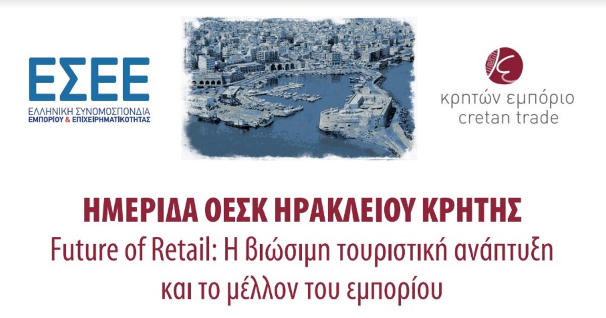 Ημερίδα με θέμα "Future of Retail : Η βιώσιμη τουριστική ανάπτυξη και το μέλλον του εμπορίου" πραγματοποιεί η Ομοσπονδία Εμπορικών Συλλόγων Κρήτης και η ΕΣΕΕ, την Δευτέρα 3 Ιουνίου 2024 και ώρα 18.00, στην αίθουσα συνεδριάσεων του Επιμελητηρίου Ηρακλείου (Κορωναίου 9, Ηράκλειο Κρήτης).