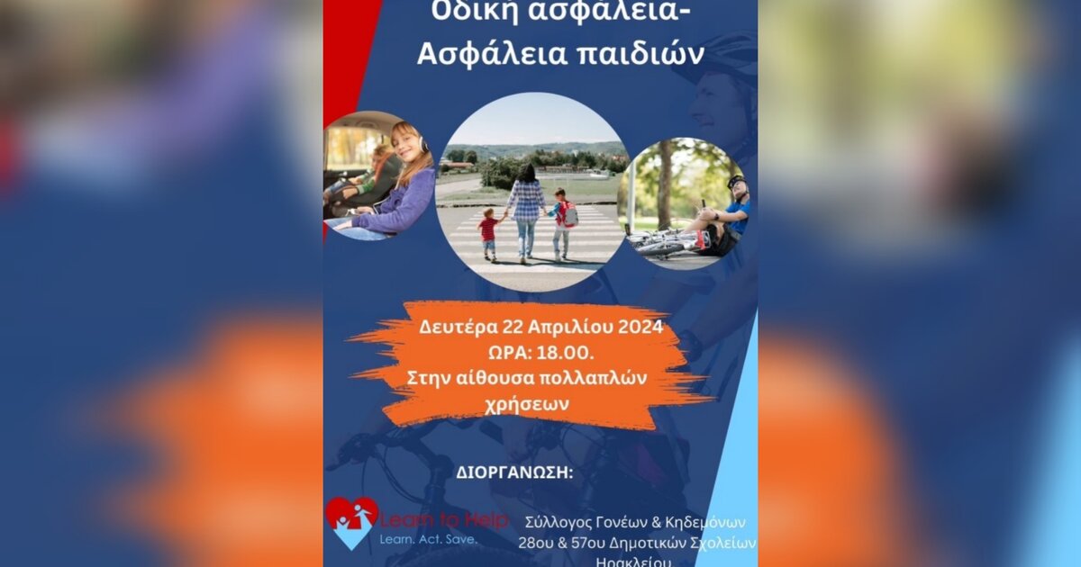 Ημερίδα με θέμα την Οδική Ασφάλεια εστιάζοντας στην Ασφάλεια των παιδιών πραγματοποιεί ο Σύλλογος Γονέων & Κηδεμόνων των 28ου & 57ου Δημοτικών Σχολείων Ηρακλείου την Δευτέρα 22 Απριλίου στις 18.00 το απόγευμα στην αίθουσα πολλαπλών χρήσεων του σχολείου.