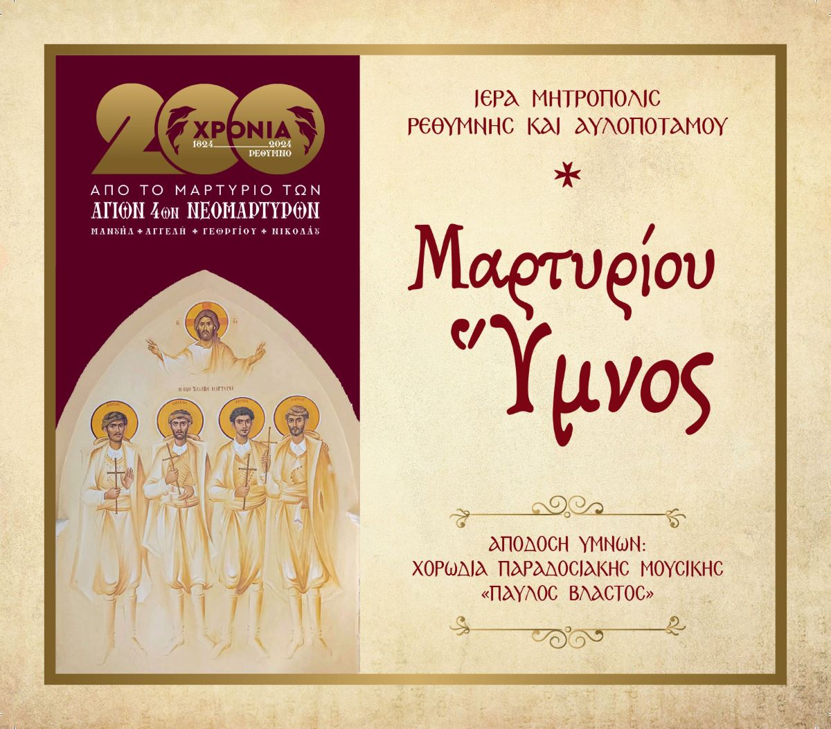 Το απόγευμα του Σαββάτου, 28ης Σεπτεμβρίου 2024, στον Ιερό Ναό των Αγίων Τεσσάρων Μαρτύρων της πόλεως Ρεθύμνης, πραγματοποιήθηκε η παρουσίαση του ψηφιακού δίσκου με τίτλο «Μαρτυρίου Ύμνος», ο οποίος εκδόθηκε από την Ιερά Μητρόπολη Ρεθύμνης και Αυλοποτάμου, στο πλαίσιο των επετειακών εορτασμών για τη συμπλήρωση 200 ετών από τη μαρτυρική τελείωση των Αγίων Τεσσάρων Νεομαρτύρων του Ρεθύμνου, Γεωργίου, Αγγελή, Μανουήλ και Νικολάου, και αποτελεί έργο της φιλόμουσης και καλλίκαρπης προσφοράς της Χορωδίας Παραδοσιακής Μουσικής «ΠΑΥΛΟΣ ΒΛΑΣΤΟΣ», με τη μέριμνα και φροντίδα του καλλιτεχνικού διευθυντή και χοράρχη της κ. Αντωνίου Μιχελουδάκη, θεολόγου καθηγητή και Πρωτοψάλτου του Ιερού Ναού Αγίων Τεσσάρων Μαρτύρων πόλεως Ρεθύμνης.