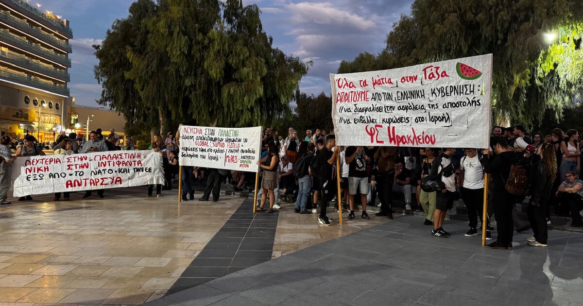 Πολίτες, φοιτητές, μέλη συλλογικοτήτων και σωματείων, όπως και συνδικαλιστές, συγκεντρώθηκαν το απόγευμα της Πέμπτης στην πλατεία Ελευθερίας στο κέντρο του Ηρακλείου εκφράζοντας τη διαμαρτυρία τους για την ισραηλινή επίθεση στον στολίσκο Global Sumud Flotilla, που μετάφερε ανθρωπιστική βοήθεια στη Γάζα.