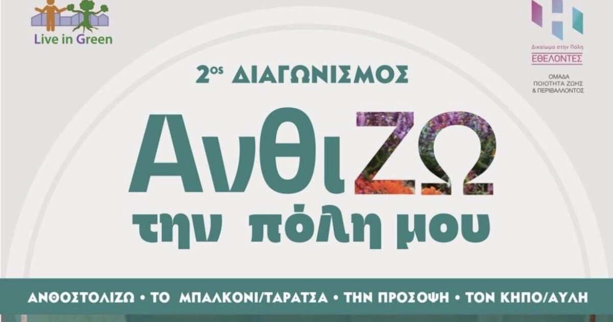 Η απονομή των βραβείων για τον 2ο Διαγωνισμό «Ανθί-ΖΩ την πόλη μου» θα πραγματοποιηθεί αυτή την Πέμπτη στις 7 το απόγευμα στο πάρκο Γεωργιάδη στο Ηράκλειο, εκδήλωση η οποία διοργανώνεται από την εθελοντική ομάδα ποιότητας ζωή και περιβάλλοντος της Δημοτικής Παράταξης «Δικαίωμα στην Πόλη».
